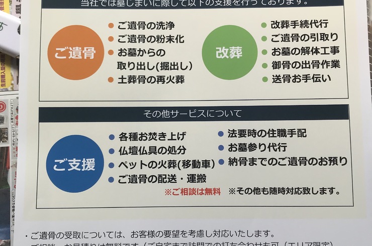 2019/11/01最近、散骨を希望されている方で墓じまいをするので少し時間を下さいと仰る方が増えています。この先、子供たちに負担を掛けたくないという事と自分も散骨を希望しているので今のうちに墓じまいをしておきたいという事です。 当社では墓じまいに際して以下の支援を行っています。 ご遺骨 ・ご遺骨の洗浄 ・ご遺骨の粉末化 ・お墓からの取り出し ・土葬骨の再火葬 改葬 ・改葬手続き代行 ・ご遺骨の... -